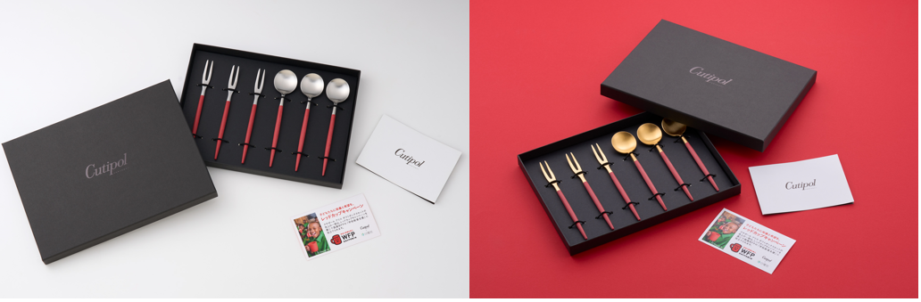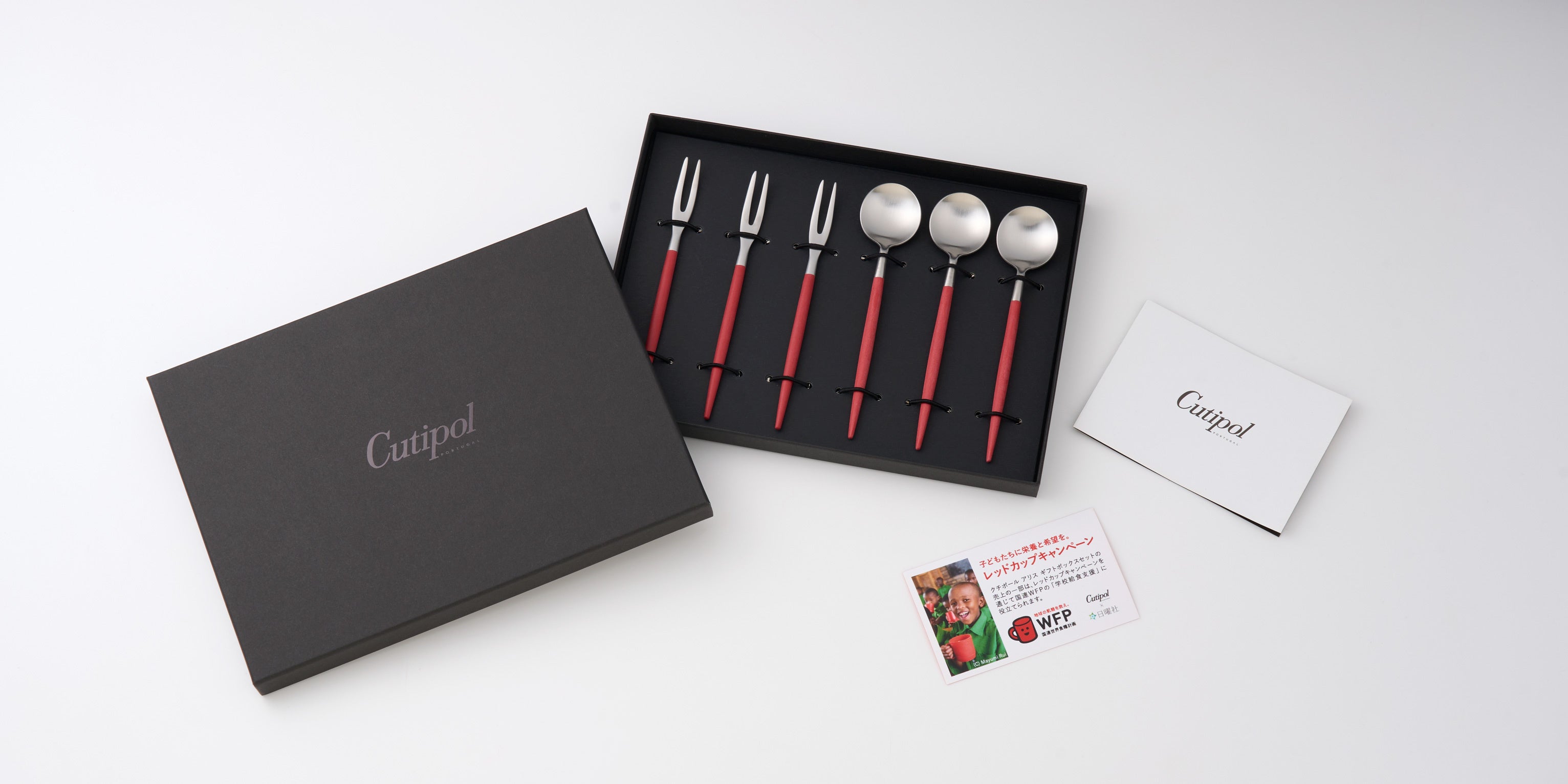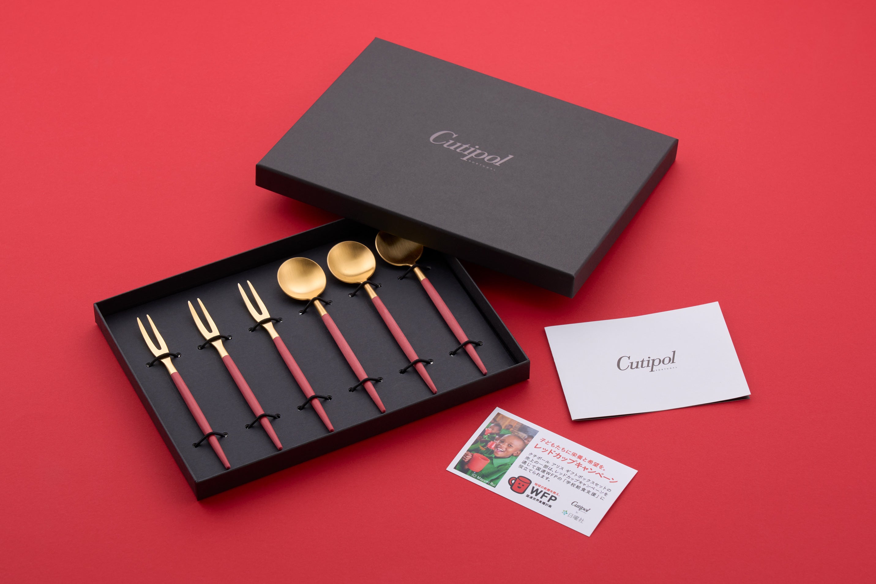 クチポール社および、クチポールの正規代理店である株式会社日曜社は、食にまつわる事業を展開する企業として2020年より同キャンペーンに賛同し、支援活動に取り組んできました。この度発売する「ティータイムセットfor Red Cup Campaign」は、クチポールの人気シリーズ「GOA」のジャパニーズフォークとティースプーンが3本ずつ入ったティータイムやデザートの時間にぴったりのギフトセットです。「レッドカップキャンペーン」に相応しい鮮やかなレッドにシルバーとゴールドをそれぞれ合わせた2タイプを、特別なギフトBOXに入れて本キャンペーン限定品としてご用意しました。