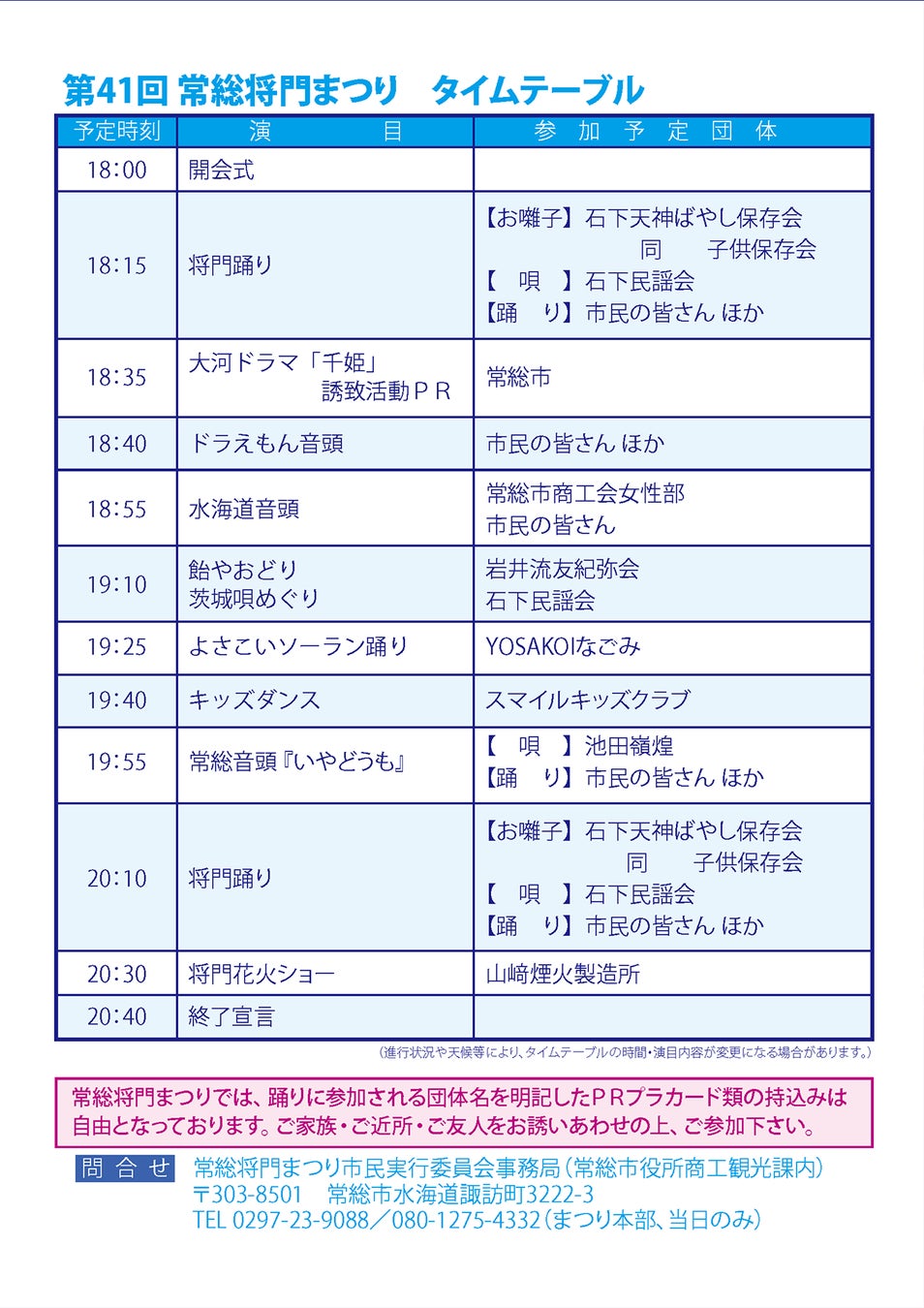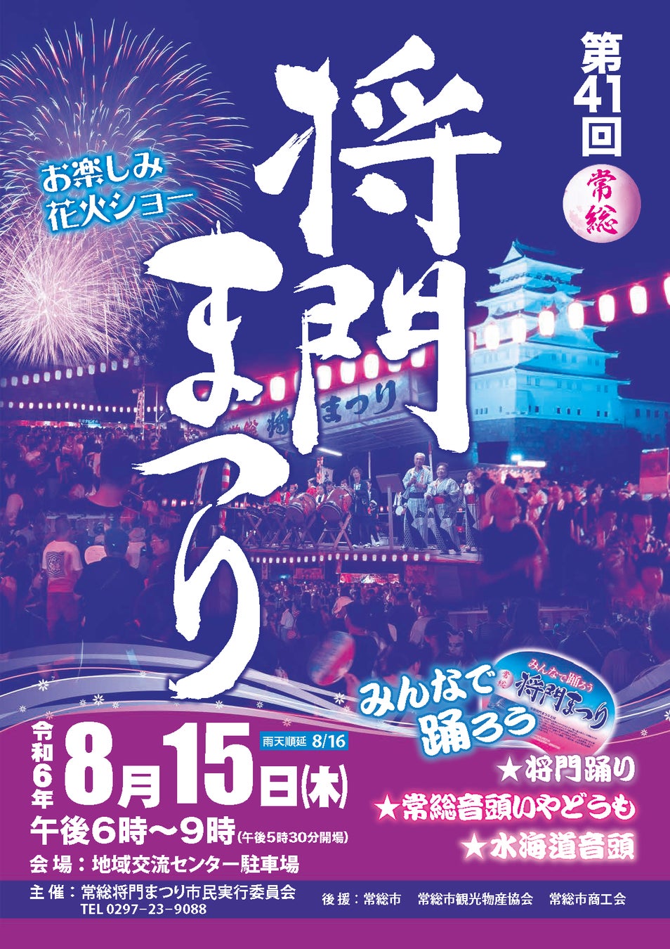 常総将門まつりを通じて市民相互のふれあいや郷土を大切にする心を育てるとともに,観光の振興及び地元産業の活性化に寄与することとし,また,常総将門まつりを常総市の伝統行事として存続振興させ,郷土芸能文化の伝承を図ることを目的に開催いたします。