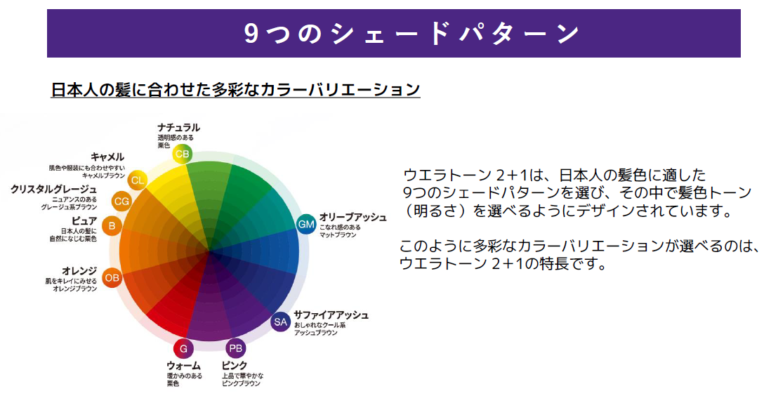 日本においては、1965年に美容室向けのヘアケア製品と美容器具が導入され、1975年に自宅で使えるおしゃれ白髪染めとして「ウエラトーン」を発売、最近では2024年4月に3ステップで髪をいたわる*黒髪用ヘアカラー「カラースタジオ」を発売いたしました。サロン生まれのヘアカラーブランドであるウエラは、コンシューマー向け製品にもサロン発想のテクノロジーを応用し、美しい髪を通じてユーザーの皆様の魅力を引き出す製品を提供し続けています。