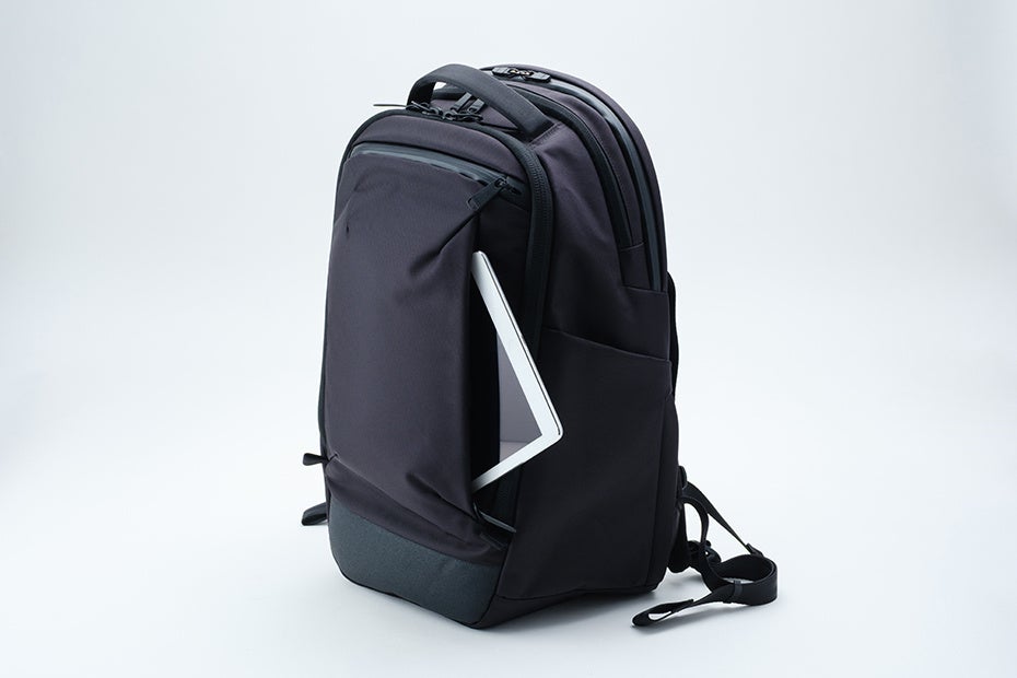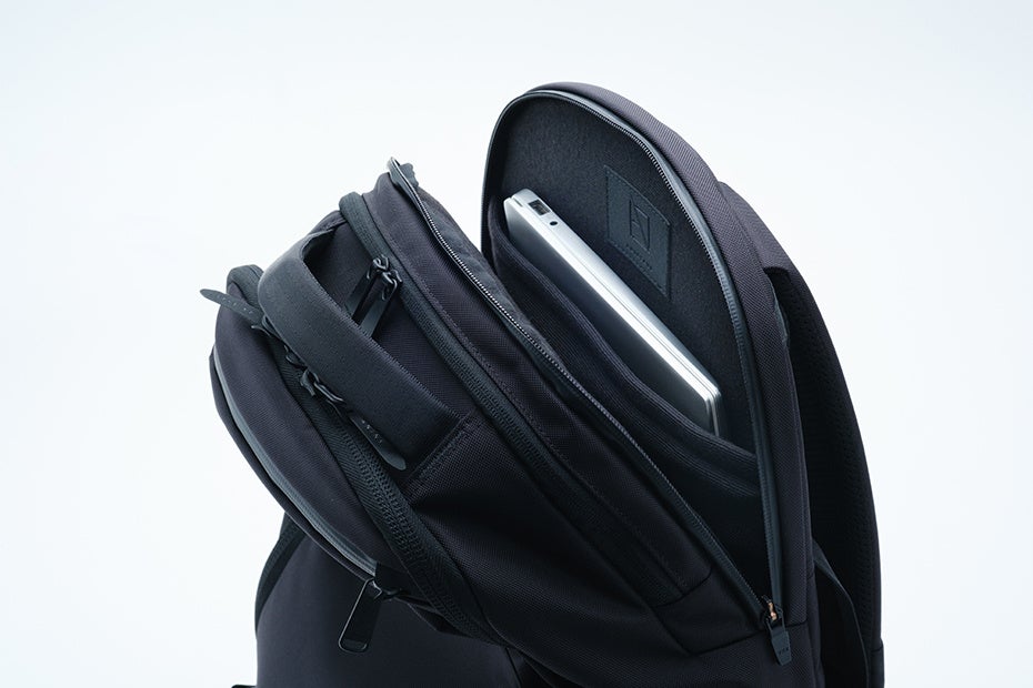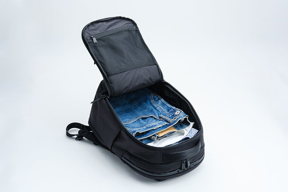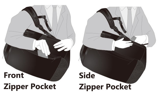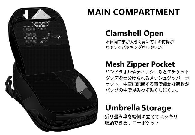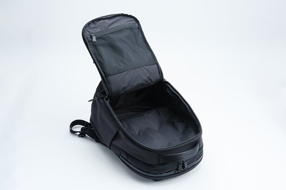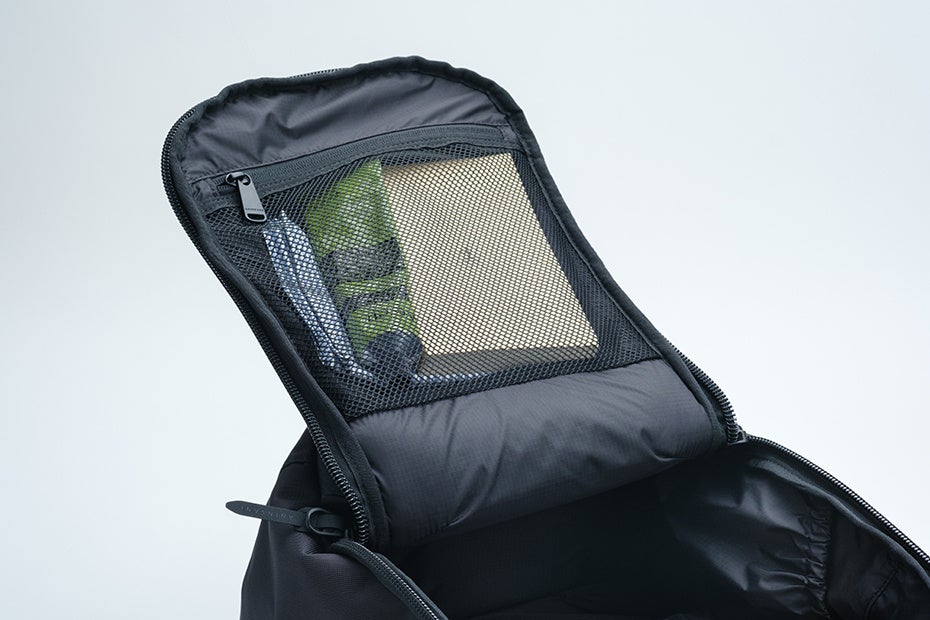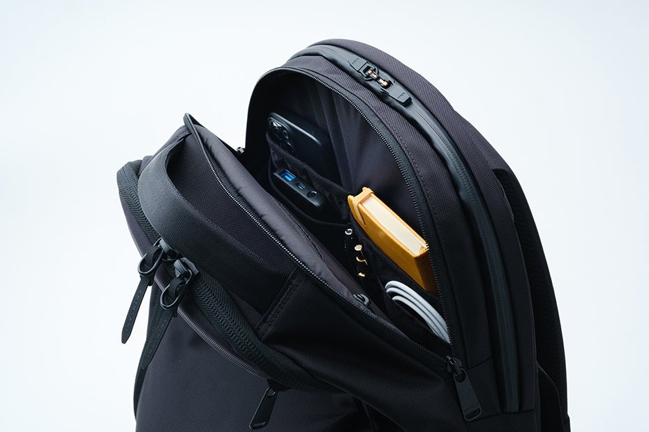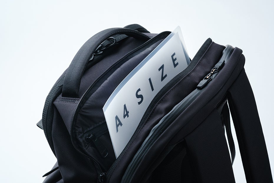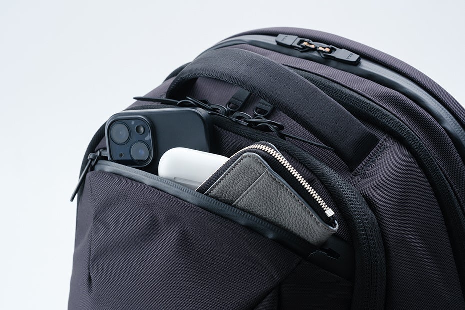 満員電車での前背負いでも取り出しやすいトップポケット。内部には起毛素材、ファスナーはYKK止水を採用しガジェット類を保護します。バッグ前面にもポケットを配置。前背負いした際、縦に開くファスナー開口は抜群の使いやすさをお届けします。