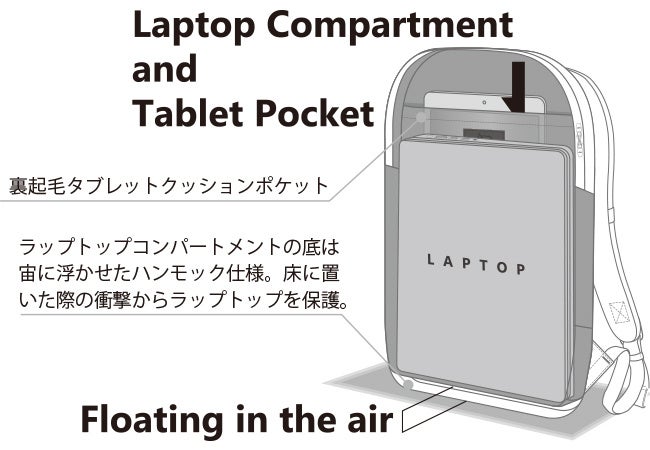 PCルームの底面は宙に浮かせたハンモック仕様。床に置いた際の衝撃から大切なPCを守ります。16インチ+14インチPC、2台を入れてもまだゆとりのある大容量。A4サイズの書類を一緒にいれることもおすすめです。防水性の高いYKK止水ファスナーを採用しています。