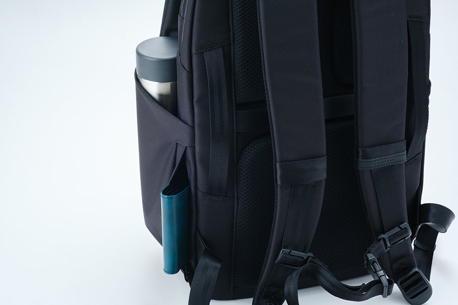 バッグ両サイドには大型のボトルポケットを配置。600mmペットボトルは勿論、大型のボトル収納出来ます。正面から右手にはサイドジッパーポケットを配置。毎日使うパスケースなどの収納に最適です。こちらのポケットはボトルを入れた状態でも荷物同士が干渉せずスムーズに出し入れが出来るよう工夫された設計になっています。