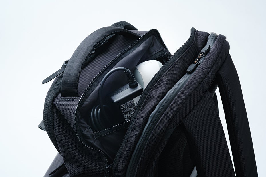 さらにルーム内前面に大型のジッパーポケットも配置。かさばる充電ケーブルやマウスも収納可能です。ガジェットルームを身体側に配置し、重心を内側へ向ける事で、重い荷物でも後ろに引っ張られにくく、体への負担を軽減します。