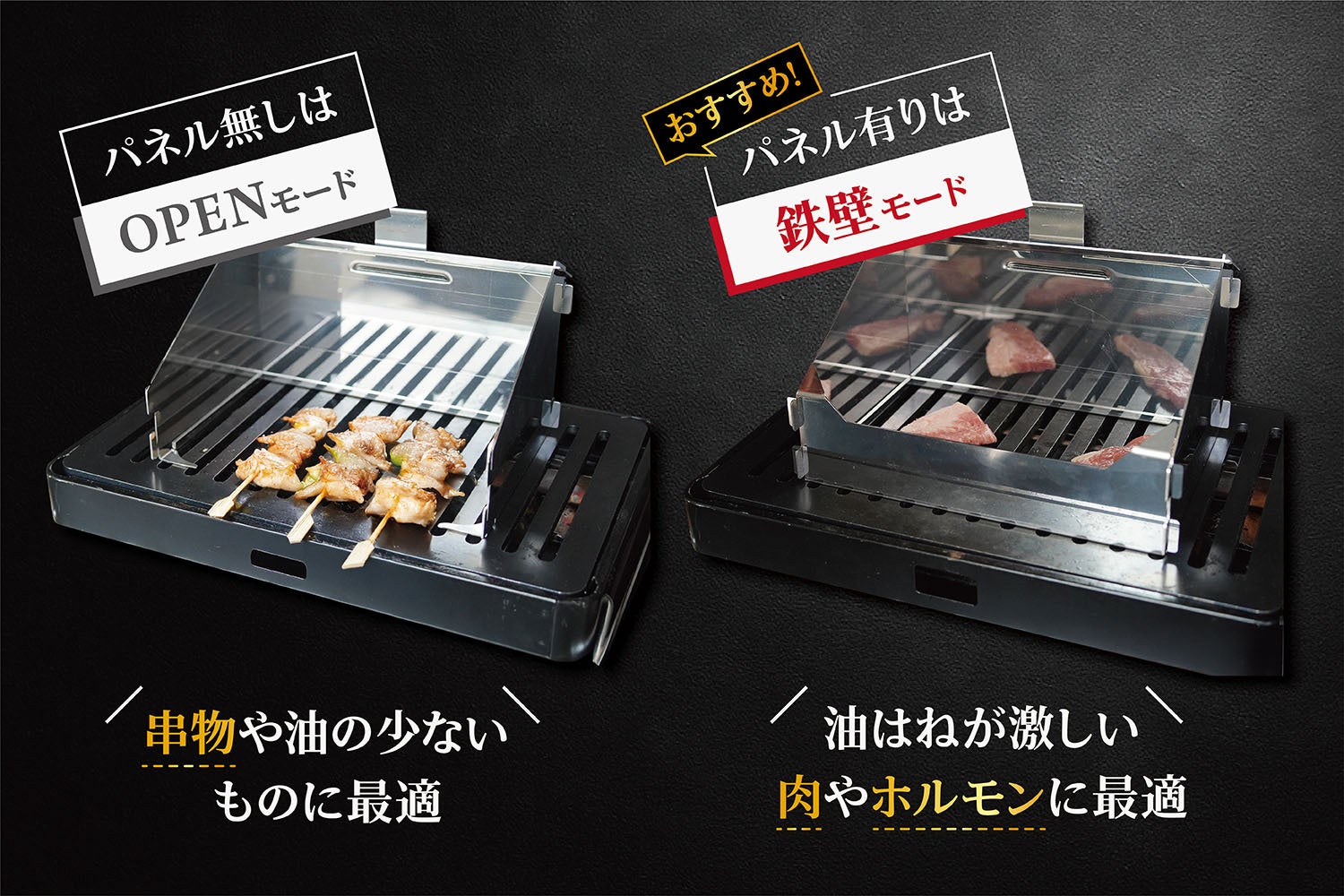 油の少ない肉や串物などはオープンモード、油はねが激しい食材は鉄壁モードで