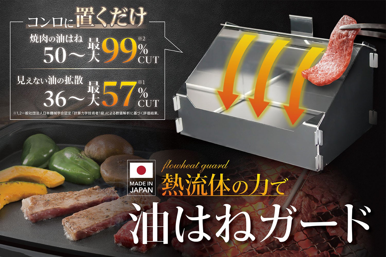 IWKイノベーション(株)新型油はねガードを開発 焼肉の油はねを最大99%カット 特許出願中の流体制御構造で目に見えない霧状の油も同時に防ぐ 世の中に存在しない油はね防止の専用構造