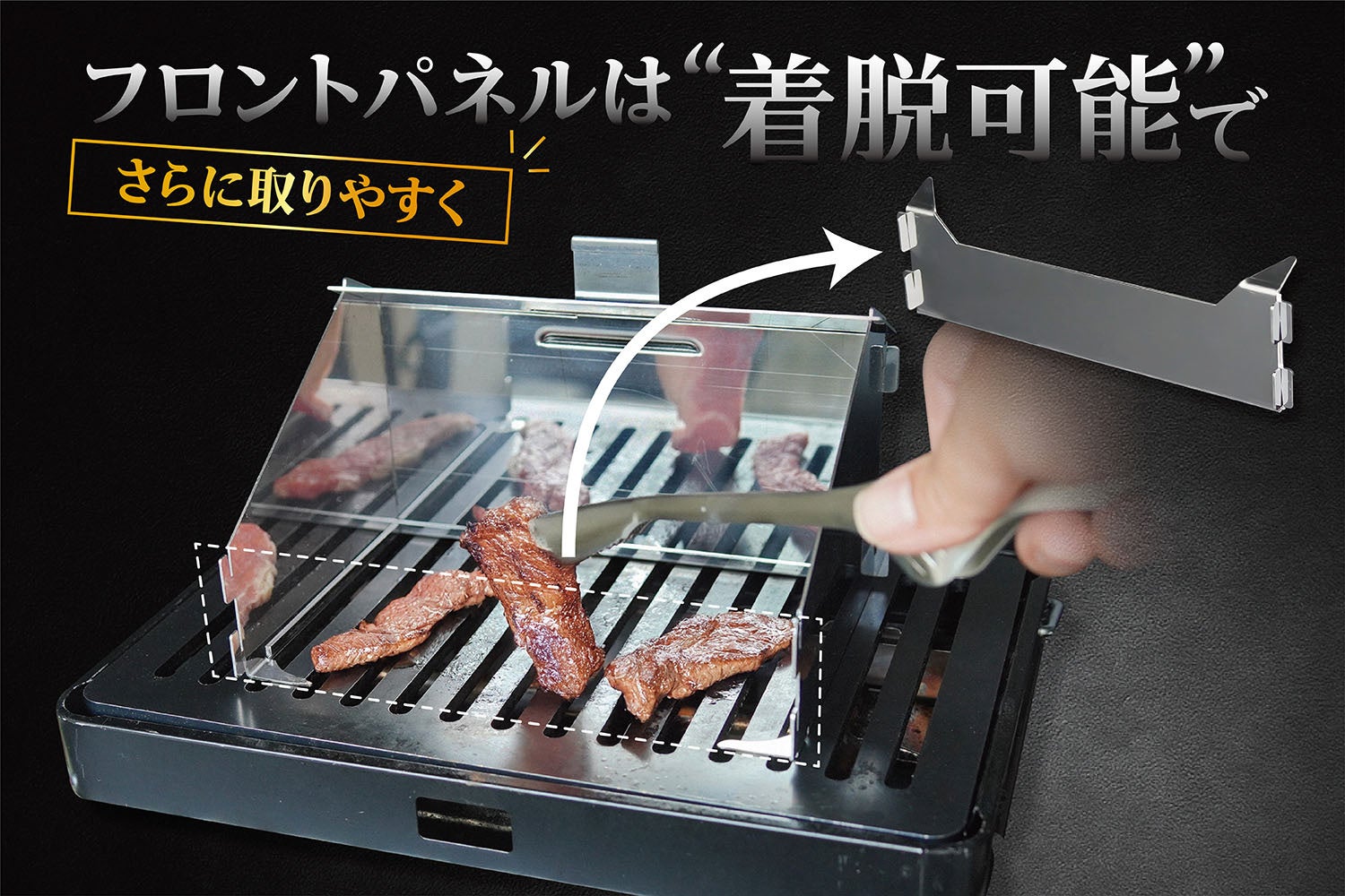 一般的なコンロ型や立てかけ式と異なり、ホットプレート・鉄板・網焼きなど、平面調理器ならどこでも設置可能。さらに分解できるため、厚さわずか2cmで収納でき、キッチンでも邪魔になりません。