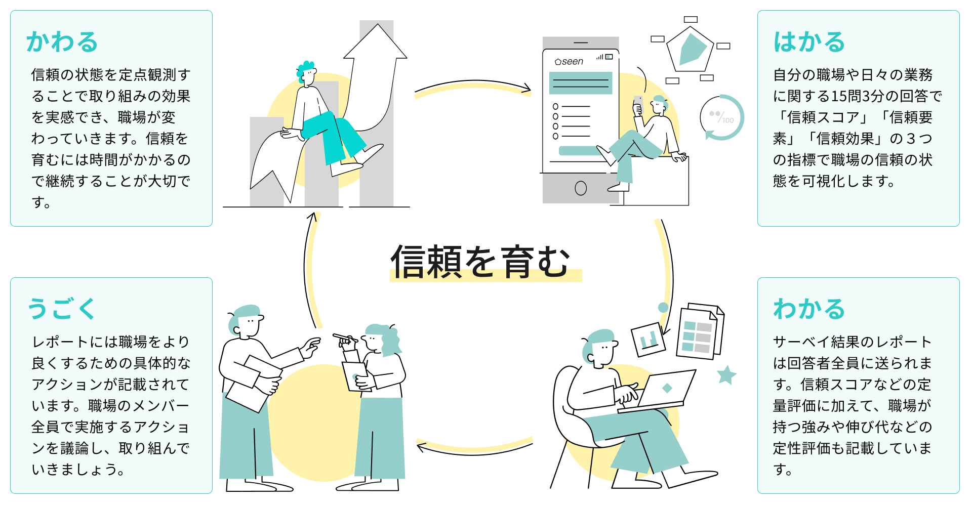Seenでは4つのステップで職場の信頼を育む支援を行います。