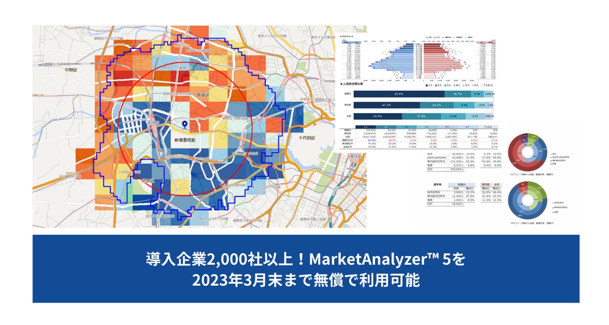 技研商事インターナショナル株式会社(名古屋本社:愛知県名古屋市、東京本社:東京都新宿区、代表取締役:小嶌智海、以下当社)は、2020年4月にリリースした2020年国勢調査(特別仕様版)を搭載した当社のエリアマーケティング用地図情報システム(GIS)「MarketAnalyzer™ 5」を2023年3月末まで長期間無償で試せる「無償提供キャンペーン」の受付を、先着100社限定にて開始します。