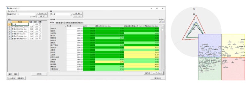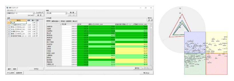 店舗の実績データと周辺の商圏情報を掛け合わせ、店舗評価・分類を行い、コンセプトの立案や人員配置、売り場施策に利用できます。