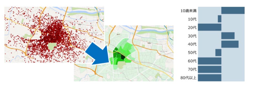 来店範囲やシェア率の可視化のほか、時系列比較や統計データと掛け合わせて顧客の特性を把握できます。