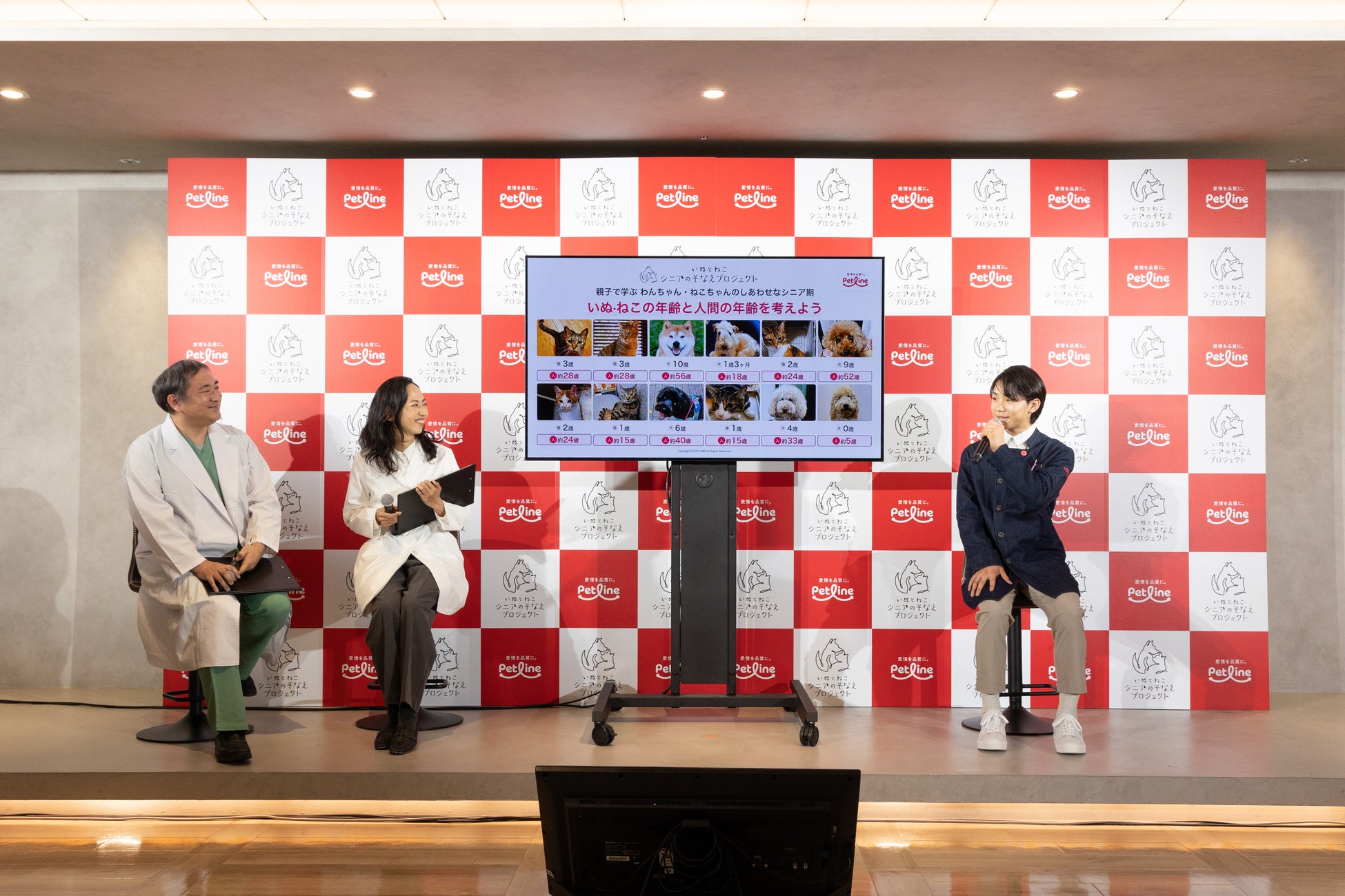 獣医師である日本大学生物資源科学部の枝村一弥先生・小澤真希子先生と、親子6組とともに、愛犬・愛猫たちのシニアについて学ぶミニイベントを開催しました。獣医師から、犬・猫の年齢に関するクイズが出題され、子どもたちは元気よく回答し、寺田さん自身も「事前に勉強した」とクイズに正解。また「シニアのそなえはいつから行うとよいのでしょうか?」という寺田さんの質問に対し、枝村先生は「暮らしを急に変えることは難しいと思うが、若いうちから少しずつそなえていくことが必要です。」と答えました。小澤先生は「高齢になるとわんちゃんもねこちゃんも認知症になることがあります。」と犬・猫の認知症の実態について解説しました。
