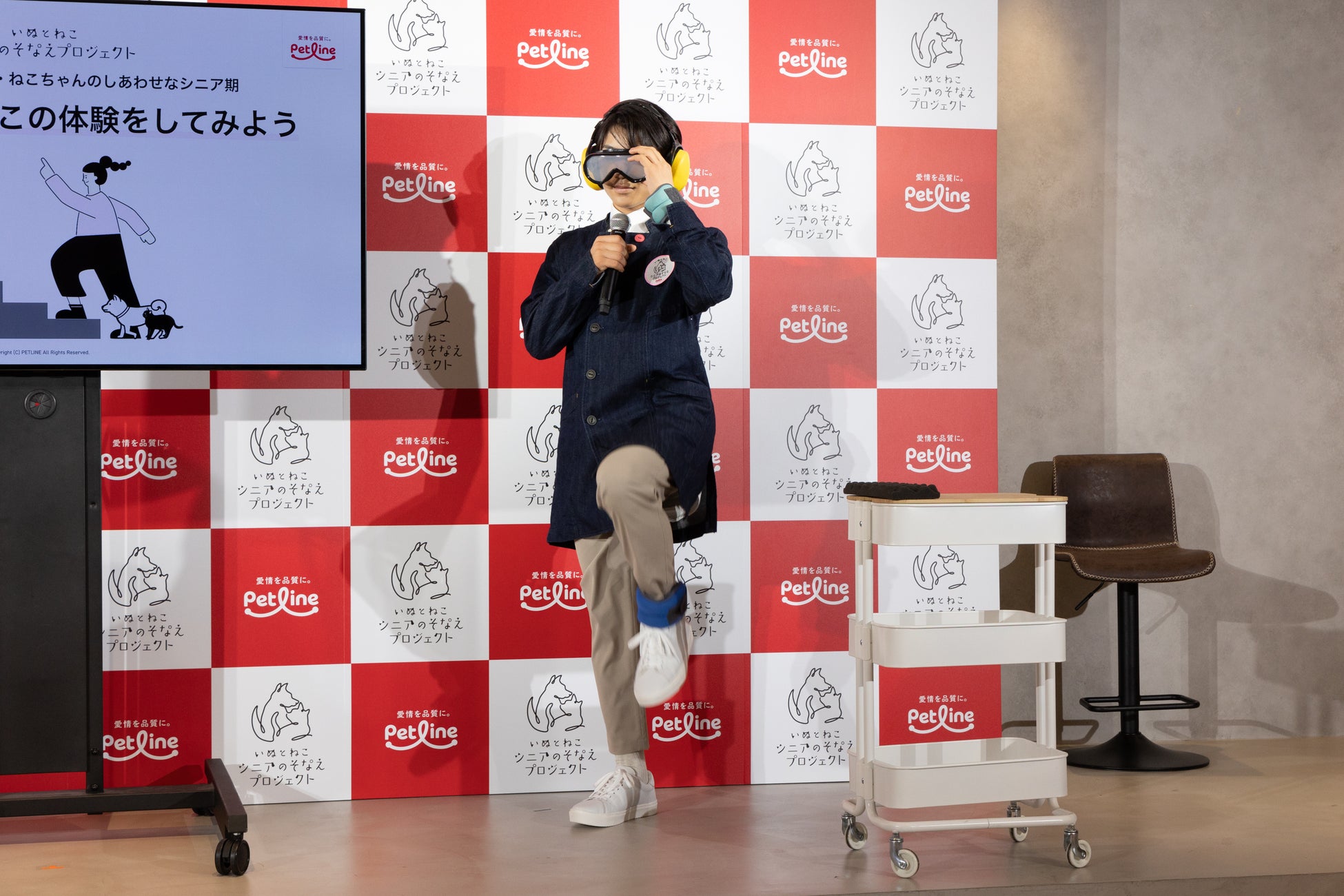 会場には、シニア期の犬・猫たちが体感する障害物の高さや、自身の体の重さを擬似体験できるコーナーを設置。関節・脚・腕などに取り付ける重り、白内障ゴーグルや聴覚低下用のヘッドホンなどを装着して体験できるようにしました。