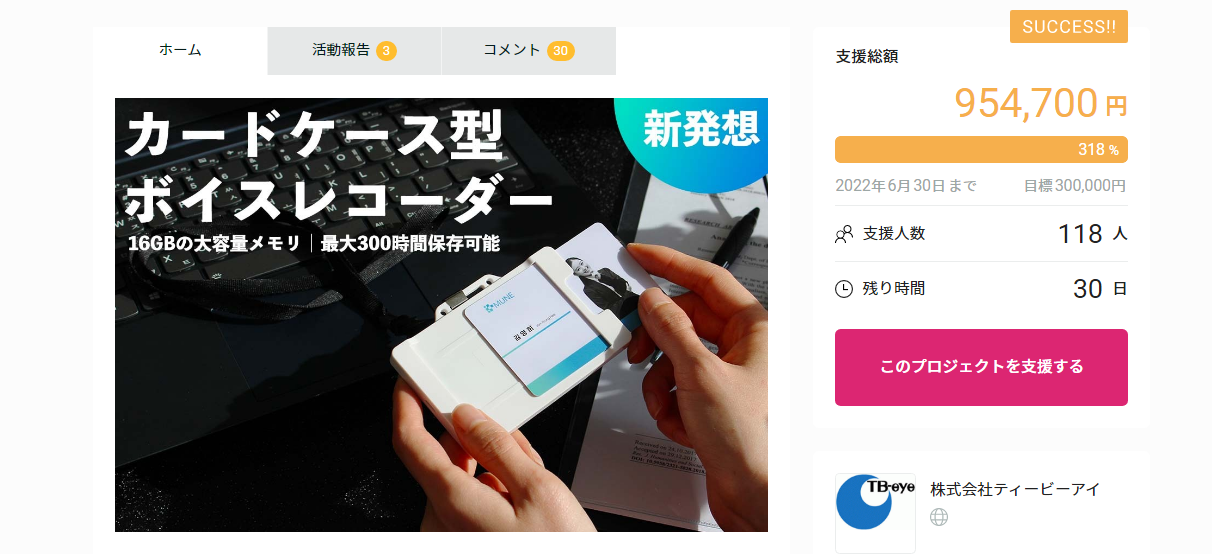 クラウドファンディングに掲載中のカードケース型ボイスレコーダー「Buzz light (バズライト)」が掲載1日目で目標金額を達成しました。