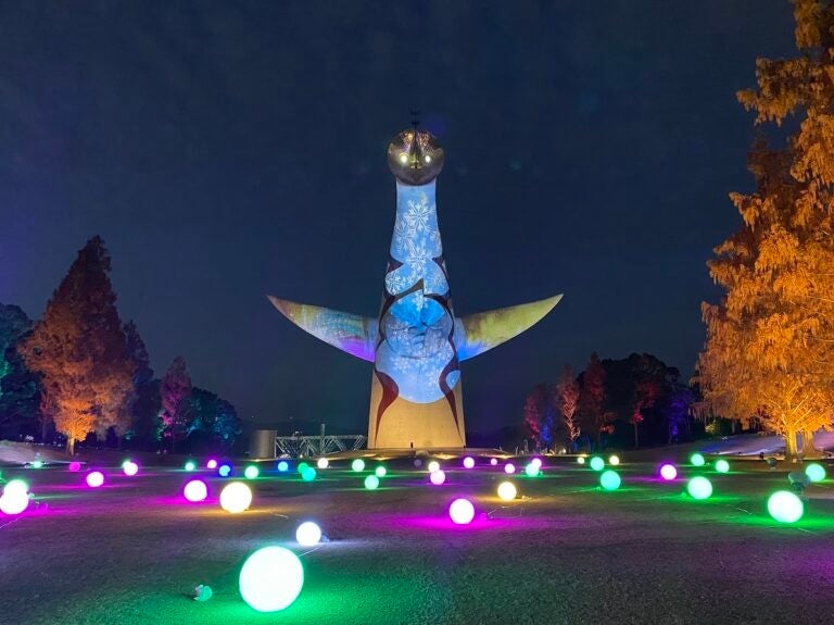 行先は、万博公園でライトアップされた太陽の塔を見に行きましょう!ペースはゆっくりです。
