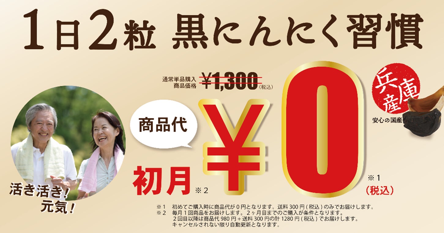多くの方に気軽に始めていただけるよう初月商品代0円でお届けします。2回目以降も通常商品25%OFFの980円(税込)とお得な価格のため、お手頃な価格で1日2粒の黒にんにく習慣を続けられます。