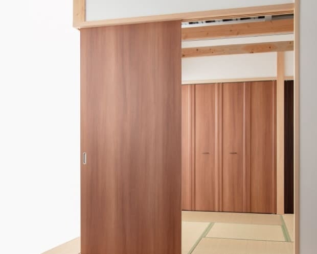 今お使いの襖(ふすま)や障子の枠(敷居)が工事なしでそのまま使える、工事いらずのリフォーム建具です。和室と洋室を仕切る際でも、どちらのお部屋にも違和感なくなじむことが特徴です。表面材は プリント合板(強化紙) ではなく オレフィンシート を使っているので強度があり、固く絞った布で水拭きできます。