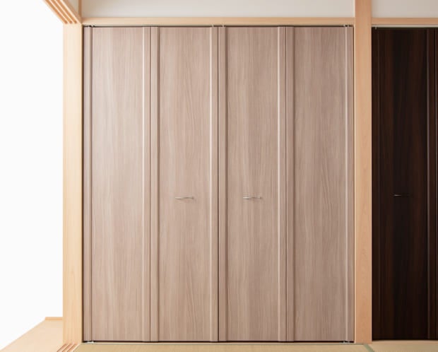 押入リフォームクローゼットは、お使いのふすまや障子の枠(敷居)がそのまま使うことができる建具です。枠の工事をしなくても良いので、時間とコストの節約になります。また、表面の素材はオレフィンシートを使用しているので上質なことも特徴です。