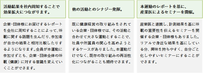 ◆本運動にご参加いただく企業・団体様には、本運動の参加者が「どれくらい寝ているのか」「睡眠の質はどうか」など睡眠状態に関するレポートをご提供します。