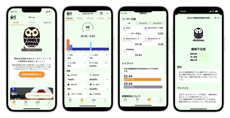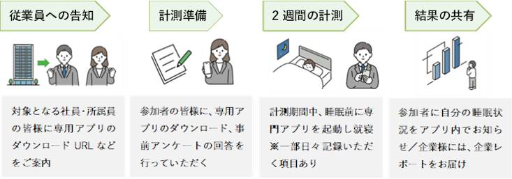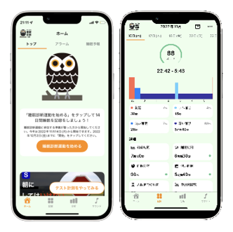 ◆参加企業・団体の社員・所属員の皆様に、専用アプリ(※スマートフォンで睡眠の質を計測することができる「ソムナス」のアプリを本運動参加者用に独自に改修・開発したもの)をインストールしたスマートフォンを枕元に置き、自身の睡眠を実施期間のうち任意の2週間計測いただきます。
