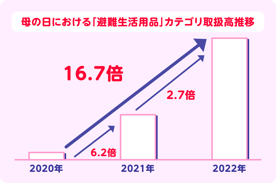 そして、今年の母の日は、防災グッズの取扱高が2021年からさらに約2.7倍になり、2020年と比較すると、約16.7倍になります。母の日に防災グッズをギフトとして贈ることが定番化しつつあります。