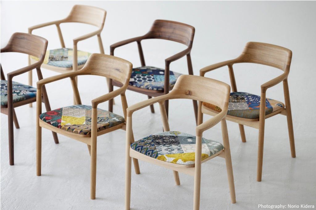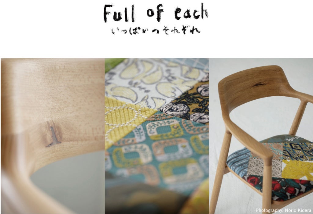 「ふしとカケラ」第6弾となる今回は、「Full of each いっぱいのそれぞれ」と題し、ビーチ、オーク、ウォルナットの3つの樹種から、木目の特徴に応じて穏やかな表情の「Modest」、生き生きとした印象の「Active」、そして個性的な紋様を浮かび上がらせる「Adventure」の3つのカテゴリーをご用意します。また、ミナ ペルホネンのカケラをパッチワークした座面もライト、ミックス、ダークの色味で3パターンが揃います。今回のスペシャルテキスタイルとして、パッチワークの中に“kakurenbo” “sleeping flower”といった二重織の表生地にハサミを入れると柄が現れる遊び心ある生地が必ず1つ入っております。柄づくりと樹種との組み合わせをそれぞれランダムにすることで、さらにバリエーションを豊かにし、偶然の出合いを楽しむコレクションになりました。
