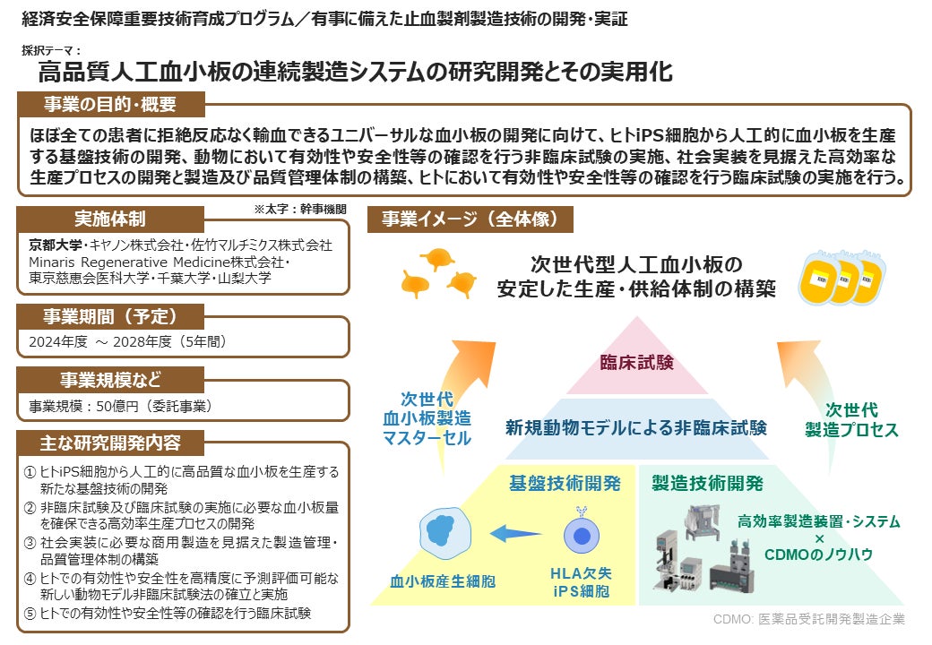 佐竹マルチミクス株式会社(本社:埼玉県戸田市、代表取締役社長:西岡光利)は、国立研究開発法人新エネルギー・産業技術総合開発機構(NEDO)が公募した「経済安全保障重要技術育成プログラム/有事に備えた止血製剤製造技術の開発・実証」において、京都大学iPS細胞研究所(CiRA)を中心に、キヤノン株式会社、Minaris Regenerative Medicine株式会社、東京慈恵会医科大学、千葉大学、山梨大学とのコンソーシアムを形成し「高品質人工血小板の連続製造システムの研究開発とその実用化」を提案、この度実施予定先として採択されました。