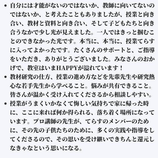 地方に住む先生は研修に参加しにくいなどのデメリットがありましたが、授業てらすは高画質・高音質のプロ授業を配信したり、オンラインセミナーで日本トップレベルの指導技術を学ぶことができるので、地方にいても最高峰の学びを得ることができます。