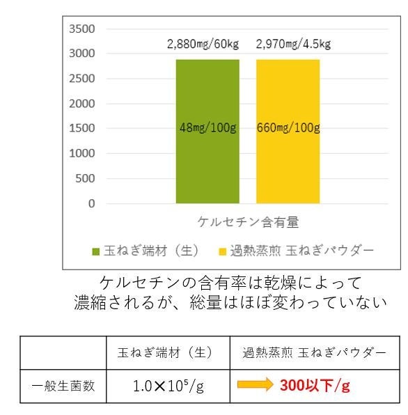 過熱蒸煎することで食品レベルの菌数に制御することができ、また玉ねぎの血液サラサラ効果で知られる機能性成分の「ケルセチン」が損なわれずに保持されていることがわかりました。