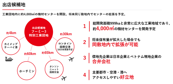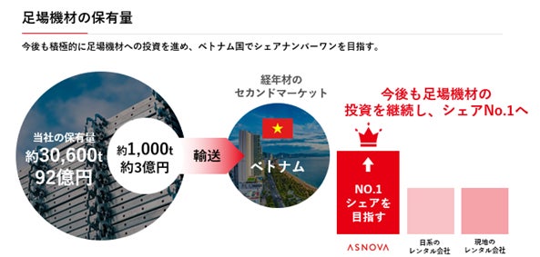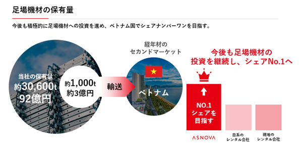 また、ベトナムの成功を足掛かりに、周辺ASEAN諸国へ進出したいと考えております。足場レンタルはASEANでは発展途上であり、日本で培ったASNOVAのレンタルノウハウを世界に広げたいと考えております。