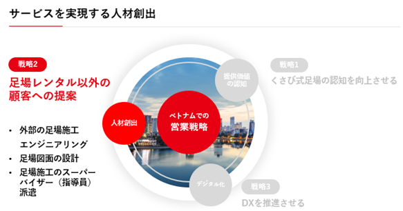2つ目に、ベトナムでは足場レンタルの提案だけでなく、足場図面の設計や、足場の施工方法について、顧客に寄り添い、アドバイスすることにより、くさび式足場を利用して頂く戦略を考えております。