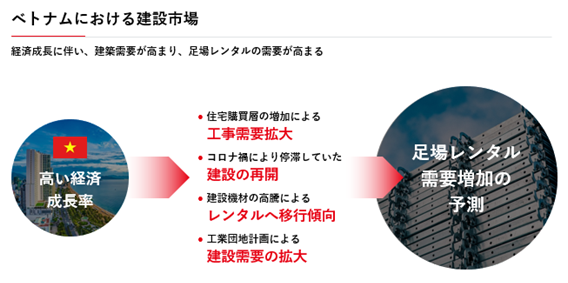 高い経済成長が見込めるベトナムで、中間所得層の増加による住宅などの工事需要の拡大、ロックダウン解除による建設工事の再開、また昨今の資材高騰による購買からレンタルへの意識の変化等、様々な要因によって、足場レンタルの需要が大きく拡大していくことが予測されます。