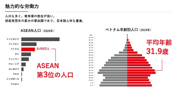 その中で、2019年時点の平均年齢は31歳という突出した若さがあり、2020年時点でASEANにおいて人口第3位のベトナムが、特に注目されています。