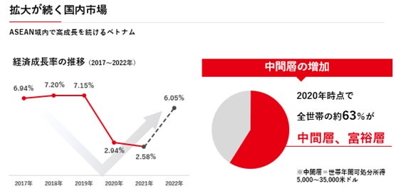 ベトナムのGDP成長率は2017年以降6~7%で推移しており、2020年、2021年はコロナウイルスの影響で2.9%、2.5%へと落ち込みましたが、マイナス成長に陥る国が多い中、ベトナムはプラス成長を維持しています。また、2022年ベトナム政府はコロナ関連規制をほぼ撤廃し、経済成長優先に舵を切った結果、2022年上半期には6%の経済成長率まで回復しています。