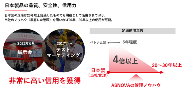 2017年からのテストマーケティングで輸送した経年くさび式足場に対して、非常に高い信用を得ていることを確認しております。ベトナム製の足場は品質が良くないため、5年程度で買い替えが必要です。しかし当社が輸送した足場は20年以上経過した足場になりますが、まだまだ活躍しており、徹底した管理を行えば、20年、30年と長く使用することが出来ます。
