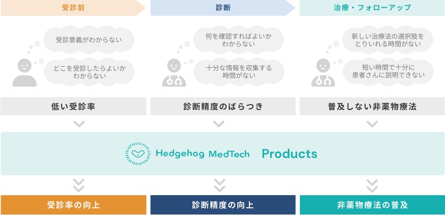 ヘッジホッグ・メドテックは、上記のプロダクト群により患者ライフサイクルに寄り添ったソリューションを提供し、患者・医療機関へ一貫した価値提供の実現を目指しています。
