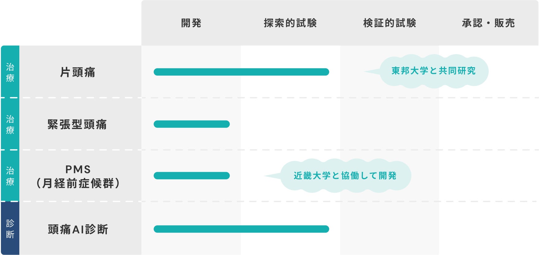 ヘッジホッグ・メドテックは片頭痛治療用アプリ、PMS(月経前症候群)治療用アプリ、新たに開発を開始した頭痛AI診断の薬事承認を目指し、開発・臨床試験を進めています。