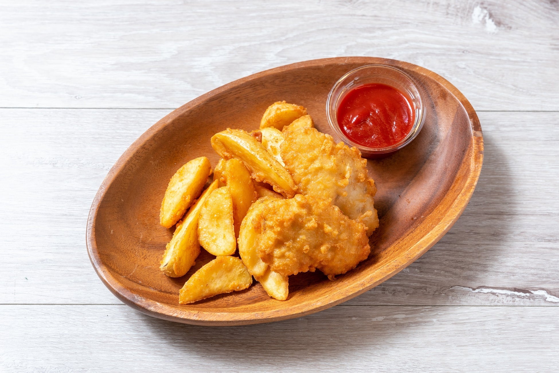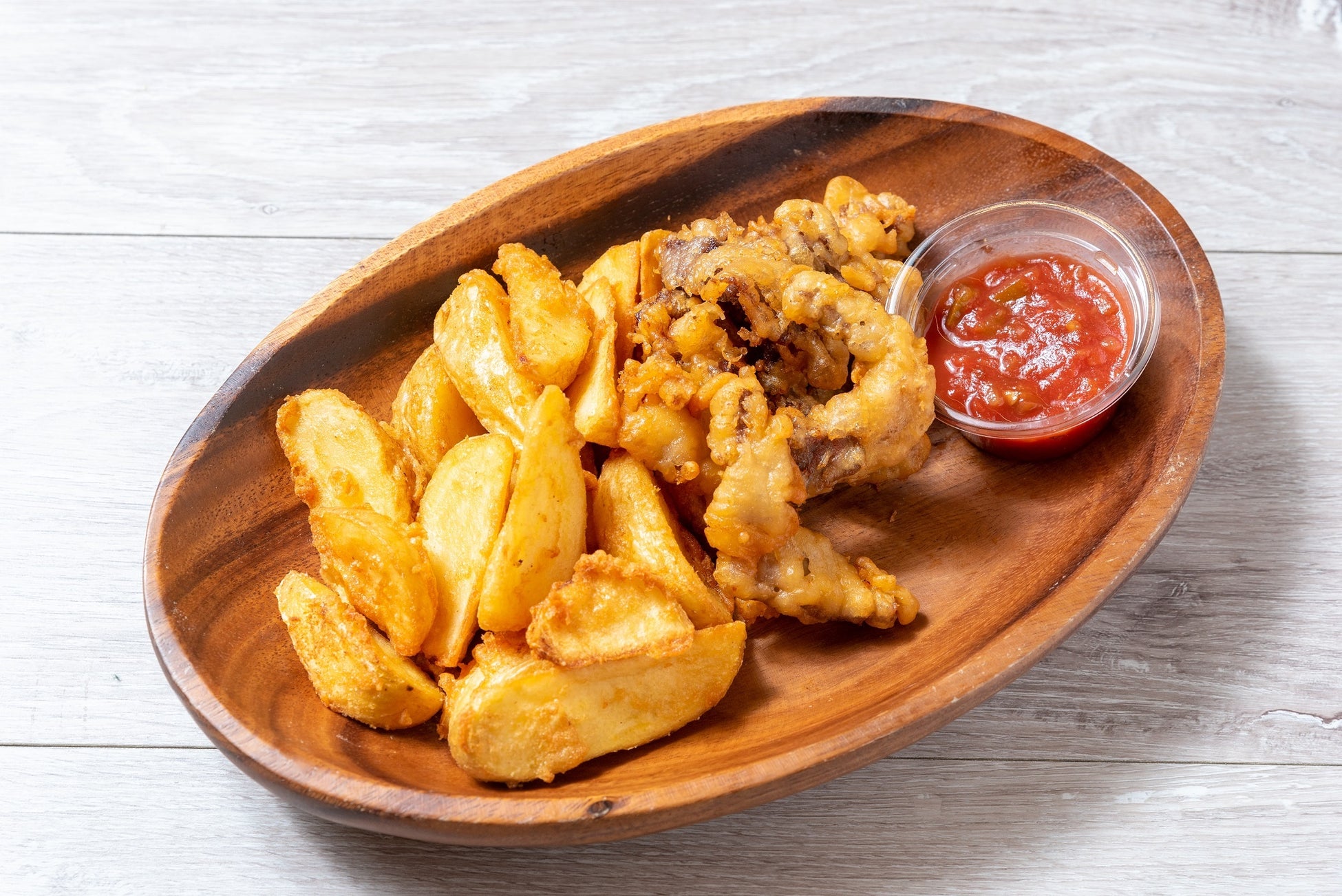 PUNK IPAビアバッターで揚げたフィッシュとポテト。薄い衣のポテトは新鮮な食感が感じられます。 ※アルコールは加熱により飛ばしております