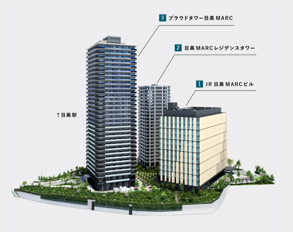 JR東日本グループと野村不動産グループとの共創による「JR目黒MARCビル(オフィス)」「目黒MARCレジデンスタワー(賃貸マンション)」スタジオやラウンジ等の共用スペースを内包した「プラウドタワー目黒MARC(分譲マンション)」の3棟からなる複合型のまちづくりです。
