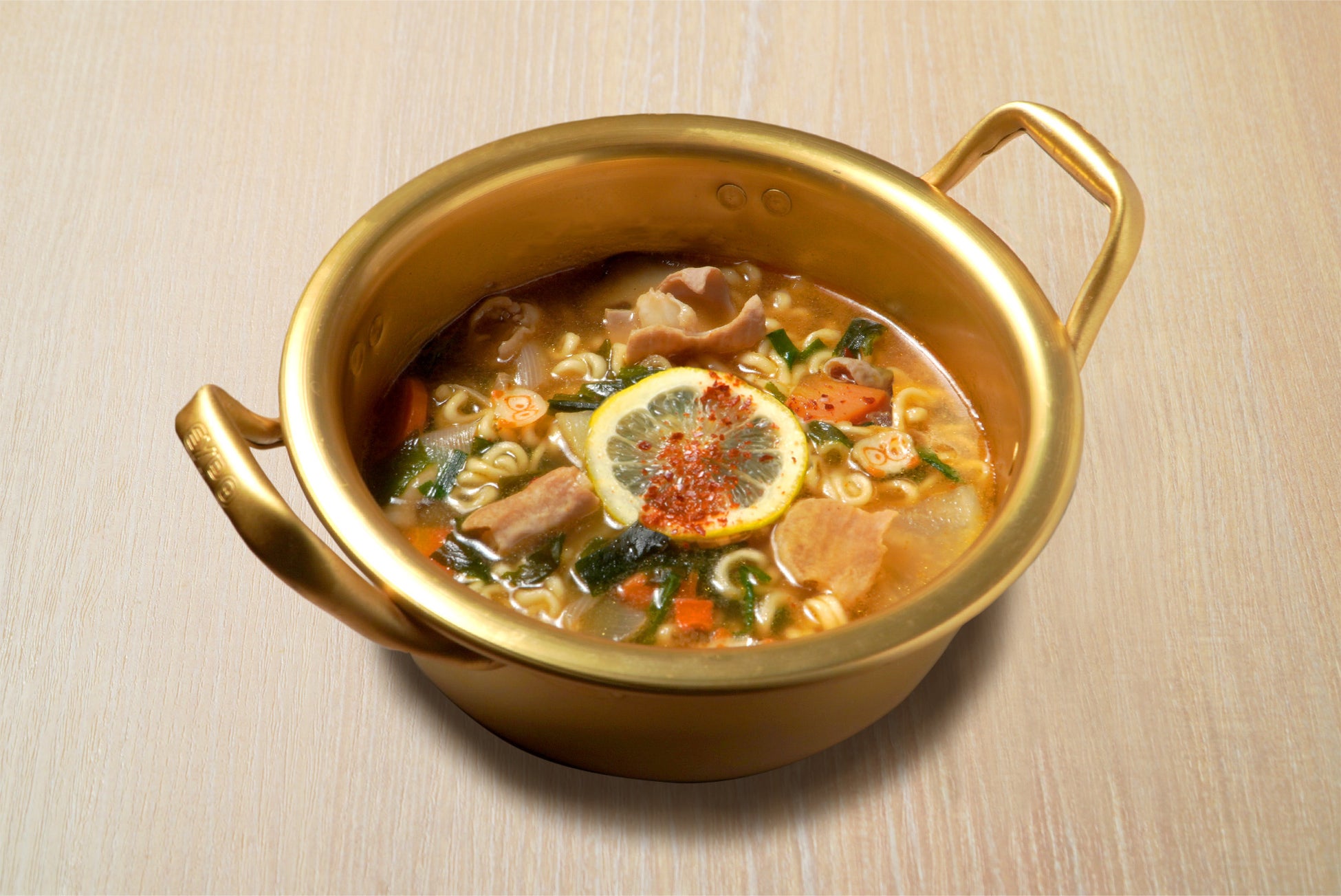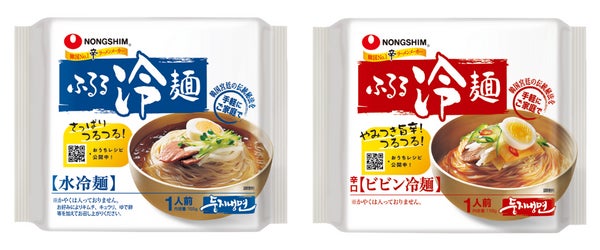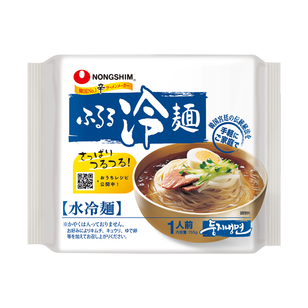 韓国特製トンチミスープ(大根の塩漬けからにじみ出たスープ)にリンゴ酢のほのかな酸味が溶け込む、甘味のあるさっぱりとした味の「水冷麺」と、コチジャンの旨みと辛さ、果実の甘みを熟成させたビビンジャンに絡めて食べる汁なし麺「ビビン冷麺」のセット。本場韓国の冷麺の味を手軽に楽しめる、熱風で乾燥したコシのあるノンフライ麺です。