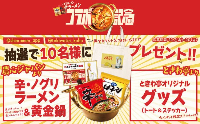 期間中、対象店舗にて、コラボメニュー「辛・ときわ亭ラーメン」もしくは「ノグリ・ときわ亭ラーメン」をご注文いただいたアプリ会員の方に、「ふるる冷麺(水冷麺・ビビン冷麺)セット」をプレゼントします。さらに、ときわ亭と辛ラーメンの公式Twitterアカウントを12月7日(水)~12月20日(火)までの期間中、フォロー&リツイートしてくれた方の中から抽選で10名様に、「辛・ノグリラーメン&鍋セット」と「ときわ亭オリジナルグッズ(トートバッグ&ステッカー)」をプレゼントします。