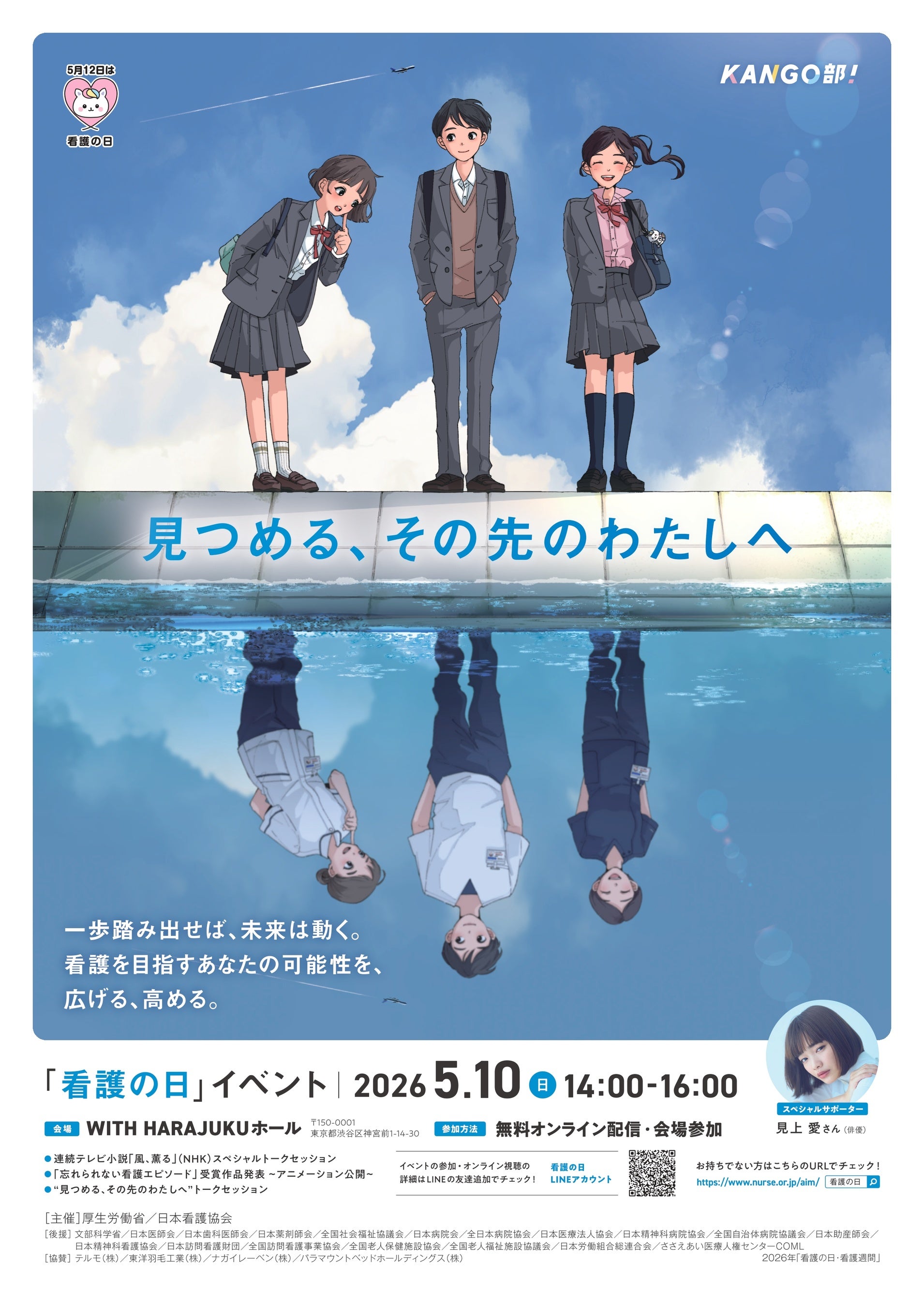 公益社団法人日本看護協会(会長:秋山智弥、会員73万人)は、2026年の「看護週間」(5月10~16日)の初日にあたる5月10日(日)に、スペシャルサポーターとして俳優の見上愛さんをお迎えし“見つめる、その先のわたしへ”をテーマに2026年「看護の日」イベント「KANGO部!」を開催します。イベントの様子は、YouTube Liveでオンライン配信も行います。