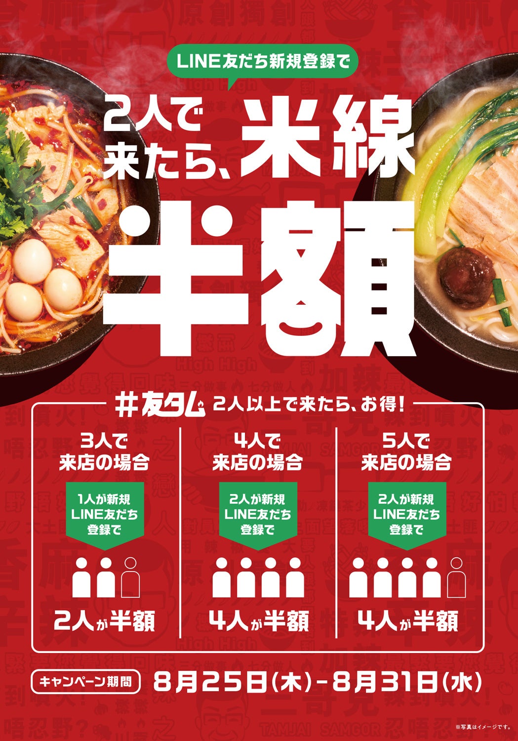 キャンペーン内容:期間中、2人の来店で、タムジャイサムゴー公式LINEアカウント新規登録でもらえる友タムクーポンをご利用いただだくと、クーポン1枚につき2名様分の米線が半額となります。