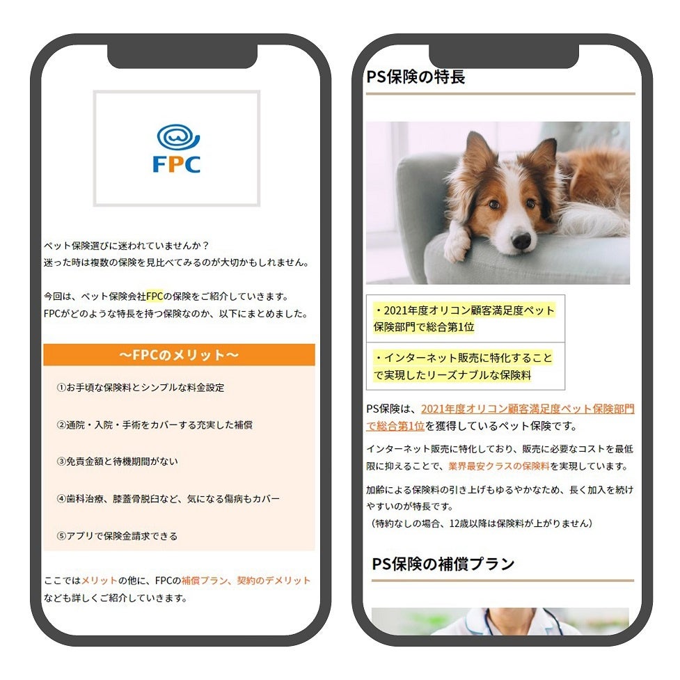 保険会社紹介ページでは「商品の特長」「補償プラン」「メリット」「デメリット」「おすすめしたい方」と5つの項目にわけて、保険会社とその会社が取り扱うペット保険商品を紹介しています。
