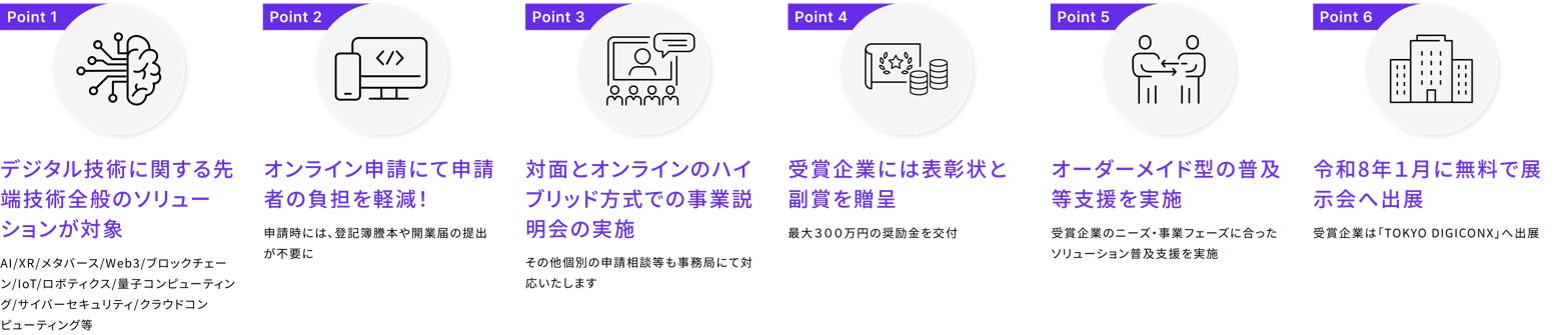 東京都(以下、「都」という。)は、都内中小企業等が有する、AI/XR/メタバース等に代表されるデジタル技術に関する先端技術を活用したソリューション等を表彰するとともに、事業連携先のマッチング支援等を行うことで、その普及を後押しし、都が抱える社会課題解決の加速化を図ることを目的とする「先端技術を活用した社会課題解決促進事業」を令和6年度から実施しています。