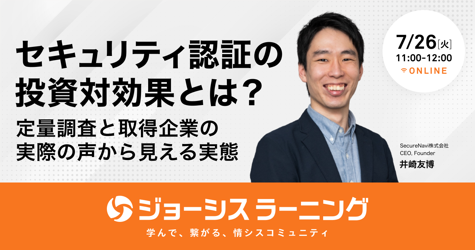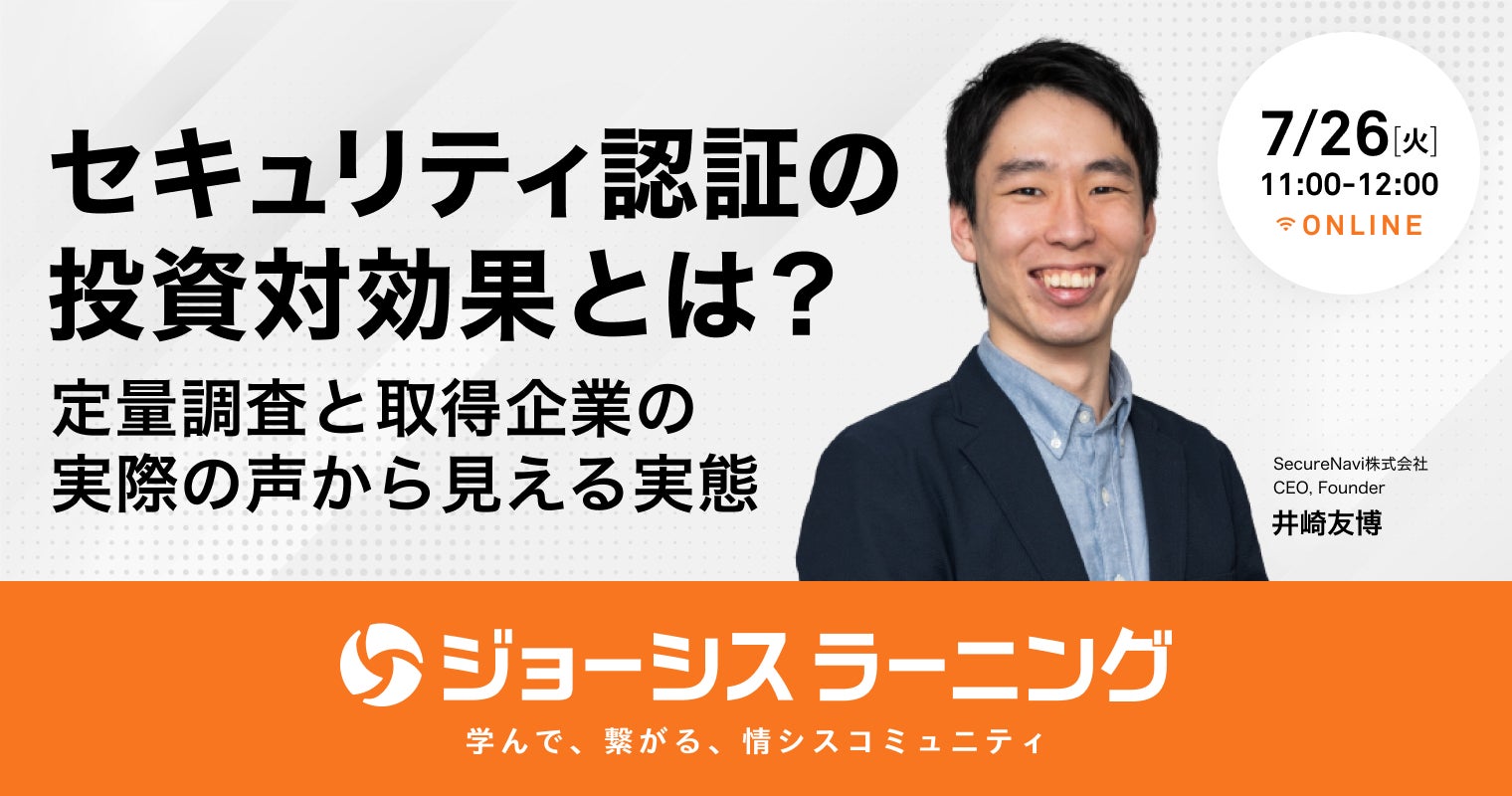 【7月26日(火)セミナー開催】<SecureNavi × ジョーシス>セキュリティ認証の投資対効果とは?〜定量調査と取得企業の実際の声から見える実態〜