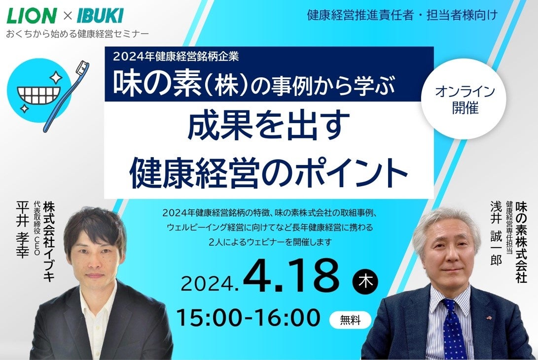 3月には2024年健康経営銘柄も発表され、各社2024年度に向けて健康経営の推進をしていることかと思います。そこで、この度、2024年健康経営銘柄に選定された味の素株式会社の事例を元に、健康経営に取り組むポイントをご紹介します。本セミナーは、長年歯科啓発活動を続けており、2024年健康経営銘柄にも選定されたライオン株式会社と共催での実施となります。