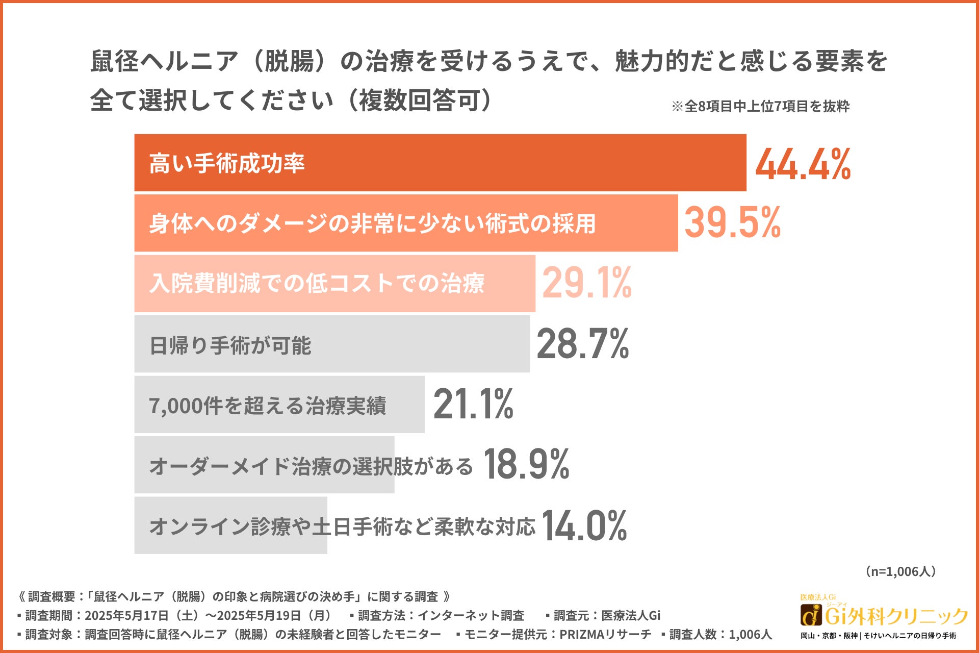「鼠径ヘルニア(脱腸)の治療を受けるうえで、魅力的だと感じる要素」について尋ねたところ、『高い手術成功率(再発率0.04%という実績)(44.4%)』が最も多く、『身体へのダメージの非常に少ない術式の採用(39.5%)』『入院費削減での低コストでの治療(29.1%)』となりました。