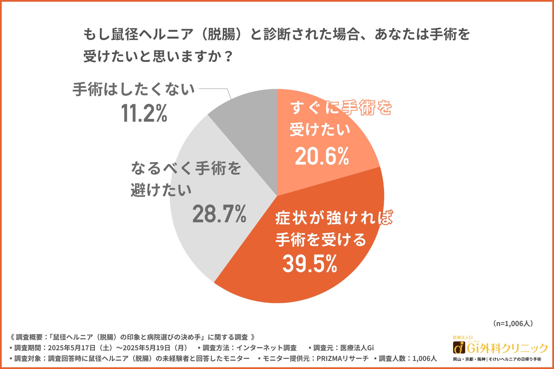 そのような中、もし自身が鼠径ヘルニア(脱腸)と診断された場合、手術を受けたいと思う方はどの程度いるのでしょう。
