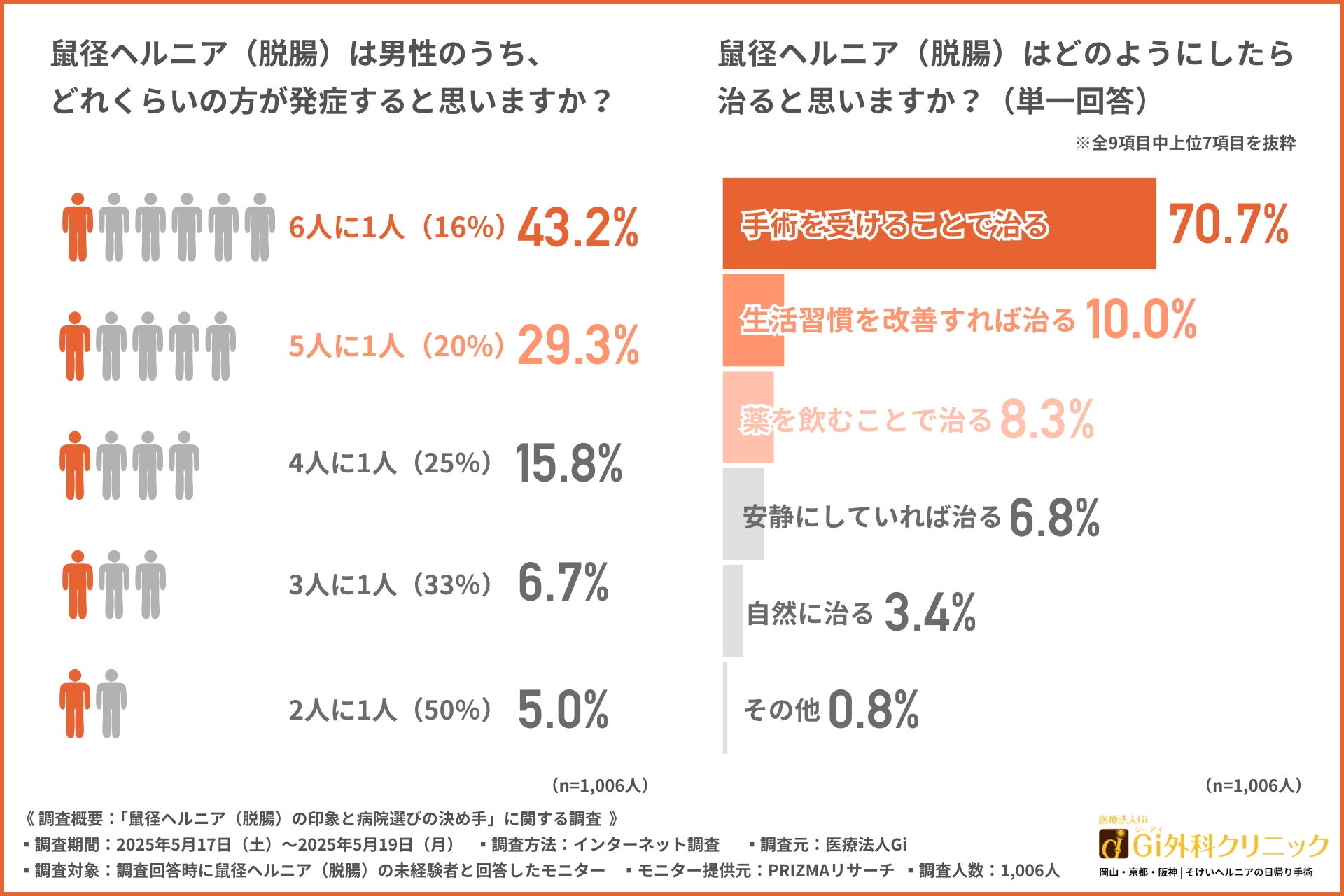 そこで今回、鼠径ヘルニアの日帰り手術専門クリニック『Gi(ジーアイ)外科クリニック』(https://gi-clinic.net/)を運営する医療法人Giは、鼠径ヘルニア(脱腸)の未経験者を対象に、「鼠径ヘルニア(脱腸)の印象と病院選びの決め手」に関する調査を実施しました。
