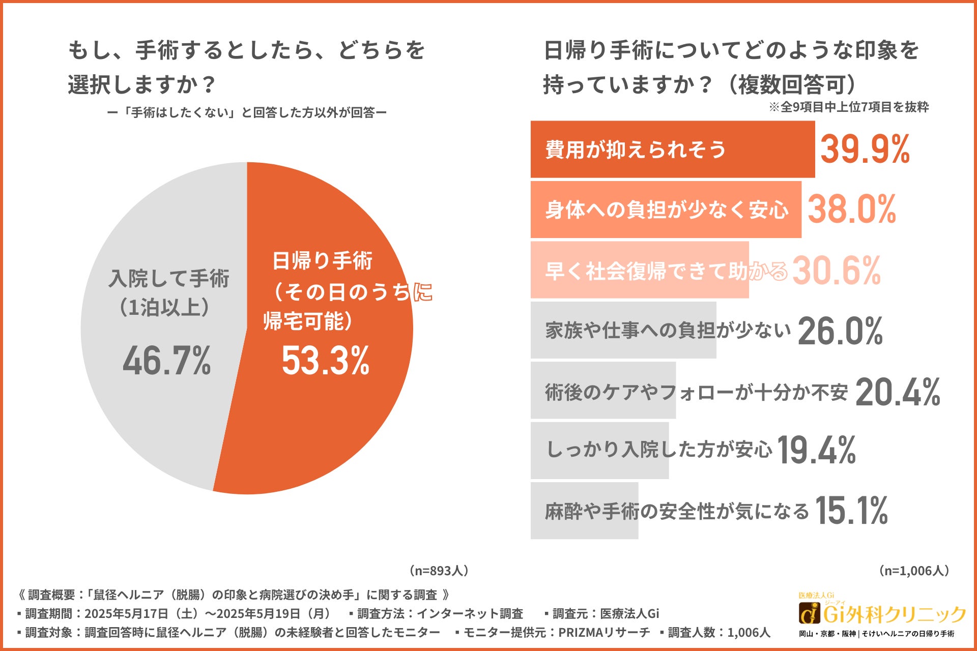 そんな中で注目すべきは、「日帰り手術」を希望する声が過半数を占めた点です。選ばれた背景には、「費用を抑えられる」「身体への負担が少ない」「早く社会復帰できる」といった生活に即した実利的な評価があり、忙しい現代人のニーズと合致していることがうかがえます。